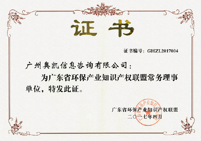 广东省环保产业知识产权联盟常务理事单位证书