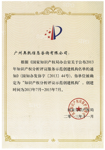 经过23年的积累和沉淀,奥凯公司先后获得“全国知识产权服务品牌机构”、“首批国家级专利导航工程支撑服务机构”、“工信部产业技术基础公共服务平台”、“广东省专精特新中小企业”、“ 全国专利文献服务网点”“ 高新技术企业”、“技术与创新支持中心(TISC)”、“中国创新创业成果交易会成果转化基地”、“广州市企业研究开发机构”、“广东省守合同重信用企业”等多项荣誉资质。并拥有一支涵盖专业情报分析、高端咨询、知识产权培训、政策与研究、专利数据处理和信息化技术开发工程师、知识产权专家团队,已具备高标准的专业知识和丰富的服务经验,为客户提供一流的知识产权服务解决方案。