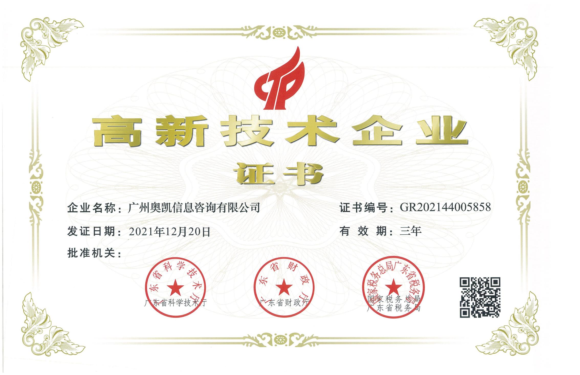 高新技术企业证书